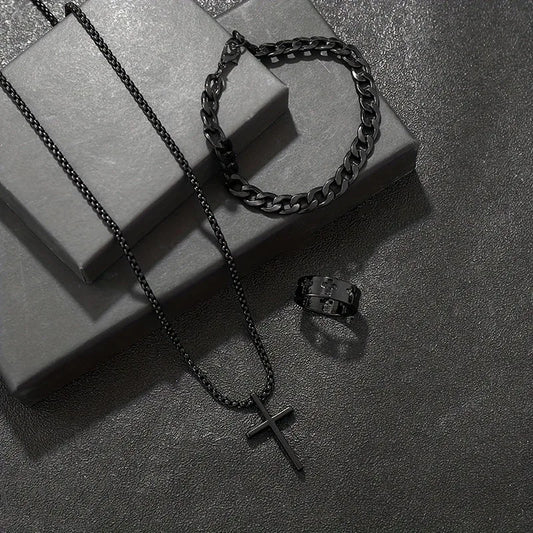 This coordinated jewelry set features a necklace, bracelet, and ring, all designed for everyday wear. The matching cross theme gives it a bold yet wearable look, making it suitable for both casual and street-style outfits. Key Features Type: Jewelry set with necklace, bracelet, and ring Material: Stainless steel metal Shape/Pattern:...