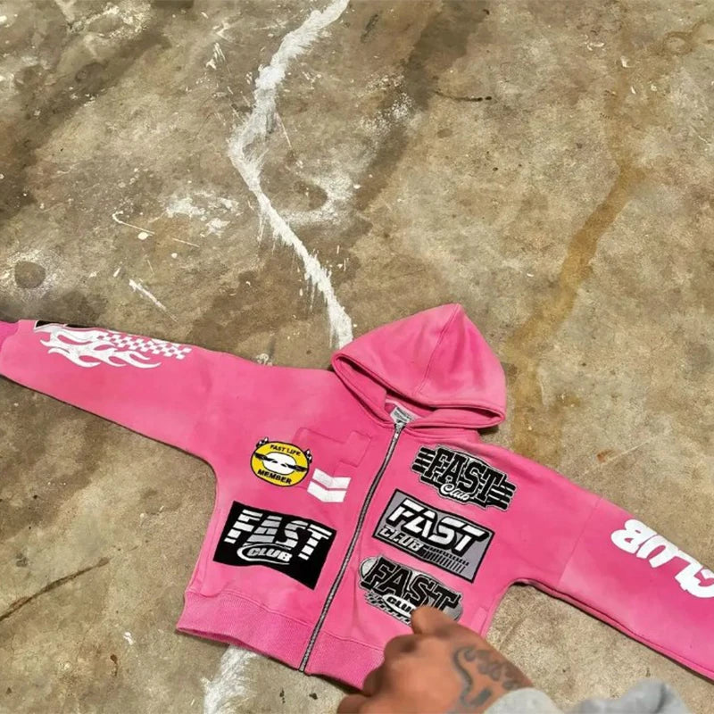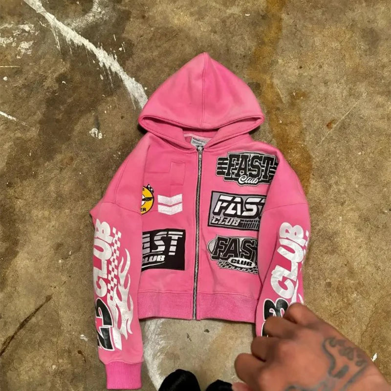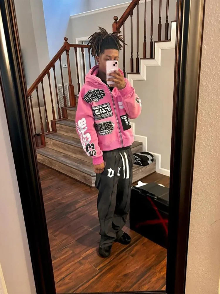 This oversized hoodie features an aesthetic Y2K graphic print with a casual streetwear feel. Designed with a zip-up hooded style and long sleeves, it offers a relaxed look that works well for autumn outfits, daily wear, or laid-back street fashion for both men and women.