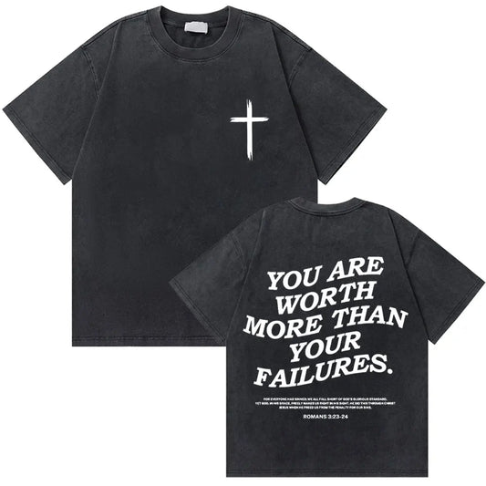This vintage-washed graphic t-shirt features a faith-inspired message designed for everyday street and casual wear. Designed for both men and women, this style features an oversized look that complements relaxed outfits and Harajuku-inspired fashion. Key Features Product type: Casual printed t-shirt Material: Cotton fabric Fabric construction: Knit Collar style: O-neck...