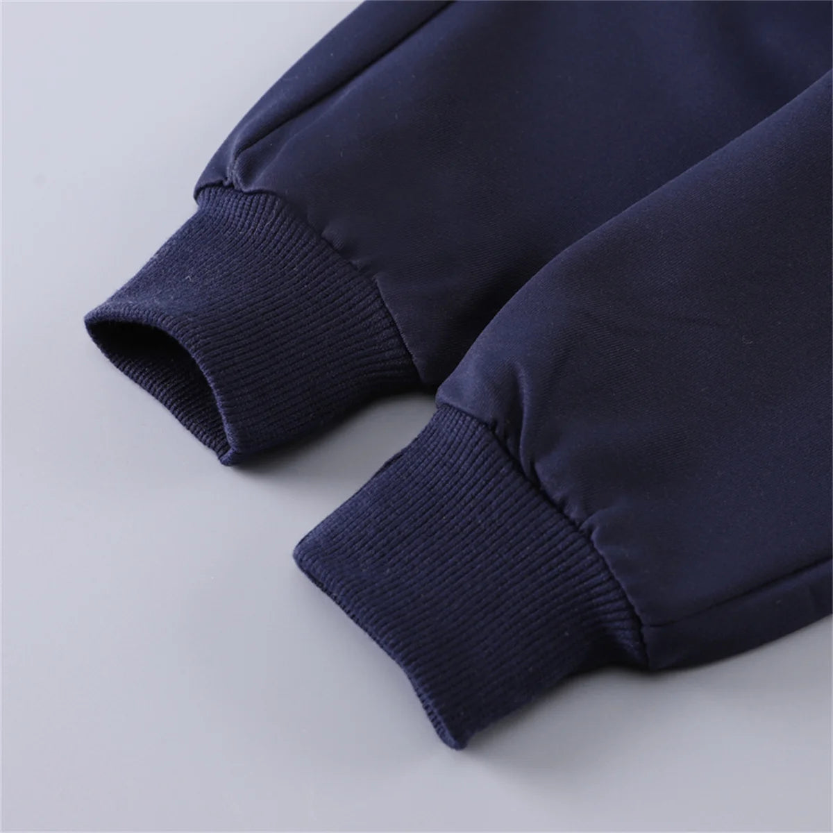 This two-piece baby outfit set is designed for comfortable wear during spring and autumn. Made from soft polyester terry fabric, it includes a long-sleeve hoodie and matching pants. The simple, solid color design is finished with a cute bear embroidery, making it suitable for everyday wear, playtime, or casual outings.