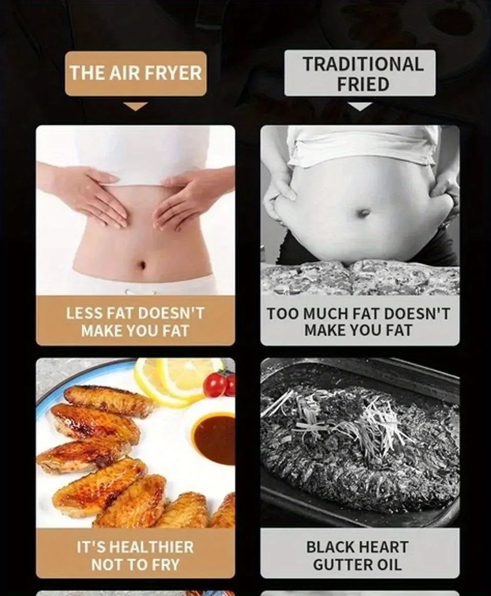 This 6L Large Capacity Digital Touch Air Fryer is built for everyday home cooking that feels easy and efficient. Designed for families and busy kitchens, it allows you to prepare full meals or quick snacks using little to no oil while still delivering crisp, flavorful results. The spacious basket lets you cook more in one cycle, while advanced hot air circulation ensures even cooking from all sides. With a modern touch display and easy-clean non-stick interior, it keeps cooking simple and cleanup stress-free.