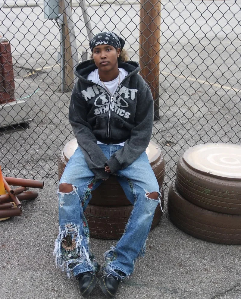 This unisex streetwear hoodie features a gothic Y2K design with embroidered letter patches and a vintage Harajuku look. Made in a zip-up hooded style with long sleeves, it offers an oversized, relaxed fit suited for casual wear, a couple of outfits, or everyday street fashion.