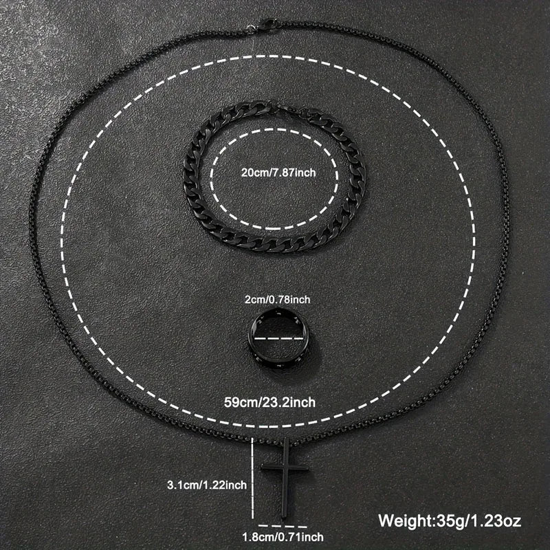 This fashion jewelry set features a necklace, bracelet, and ring, all with a matching cross theme. Designed for casual and street wear, it delivers a coordinated look in one complete set.