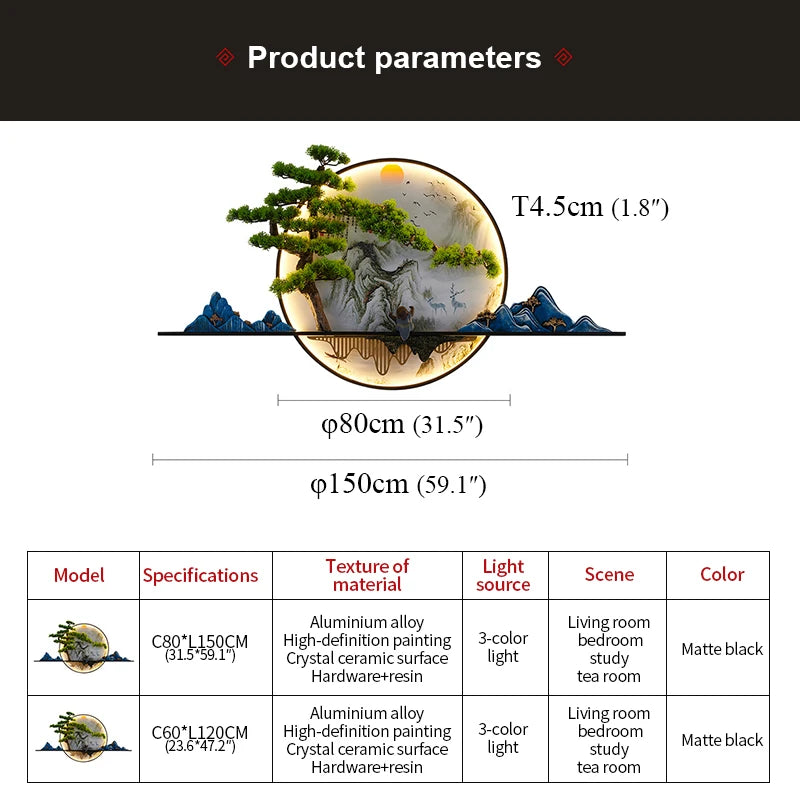 This modern picture wall light features a serene Chinese landscape design paired with soft LED illumination, creating a calm and artistic focal point for interior spaces. Designed to function as both wall art and lighting, it adds warmth and depth to living rooms, bedrooms, studies, corridors, and quiet reading areas.