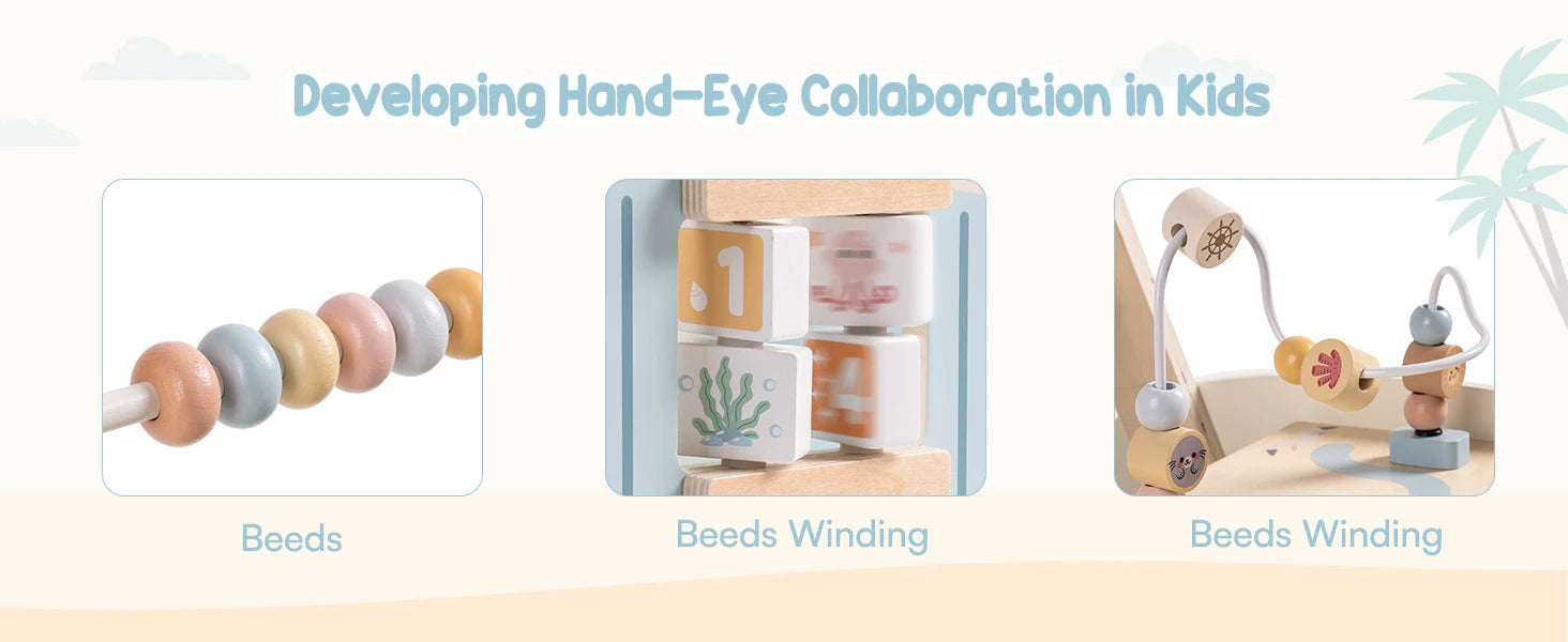 Beyond walking support, the walker functions as an activity center. Interactive features such as rotating beads, flip blocks, gears, mirrors, and maze elements help keep babies curious and focused. These activities promote fine motor control, hand-eye coordination, and early thinking skills, making the walker useful even before and after the walking stage.