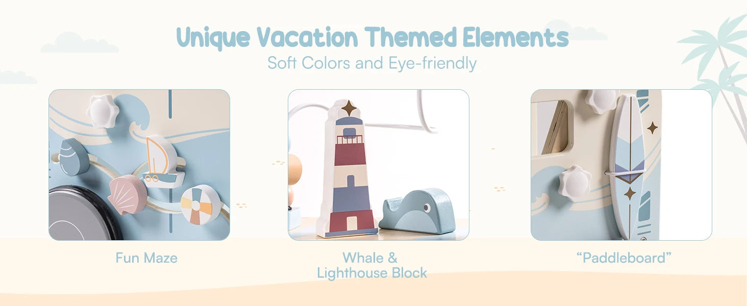 This wooden baby walker supports early walking while keeping little ones engaged through hands-on play. Designed in a cheerful bus style with soft ocean-inspired details, it encourages balance, movement, and confidence as babies take their first steps. The solid wooden frame provides steady support, and smooth-rolling wheels allow safe use on indoor surfaces.