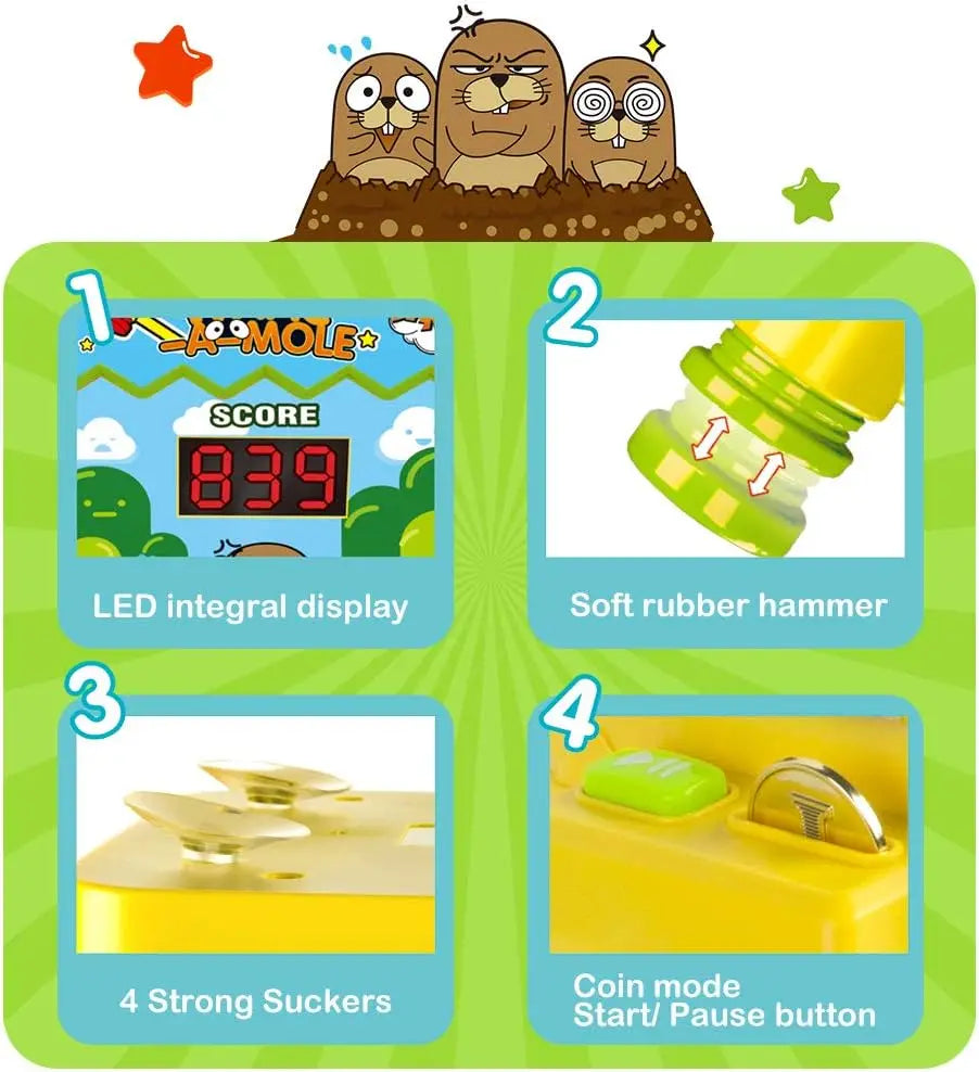 This mini coin-operated arcade game brings the classic whack-a-mole experience into a kid-friendly tabletop toy. Designed to keep children active and engaged, it features light-up moles, arcade sound effects, and a built-in scoreboard that creates an exciting, game-room feel at home. Kids can play solo or compete with friends and family while building focus, coordination, and reaction speed.
